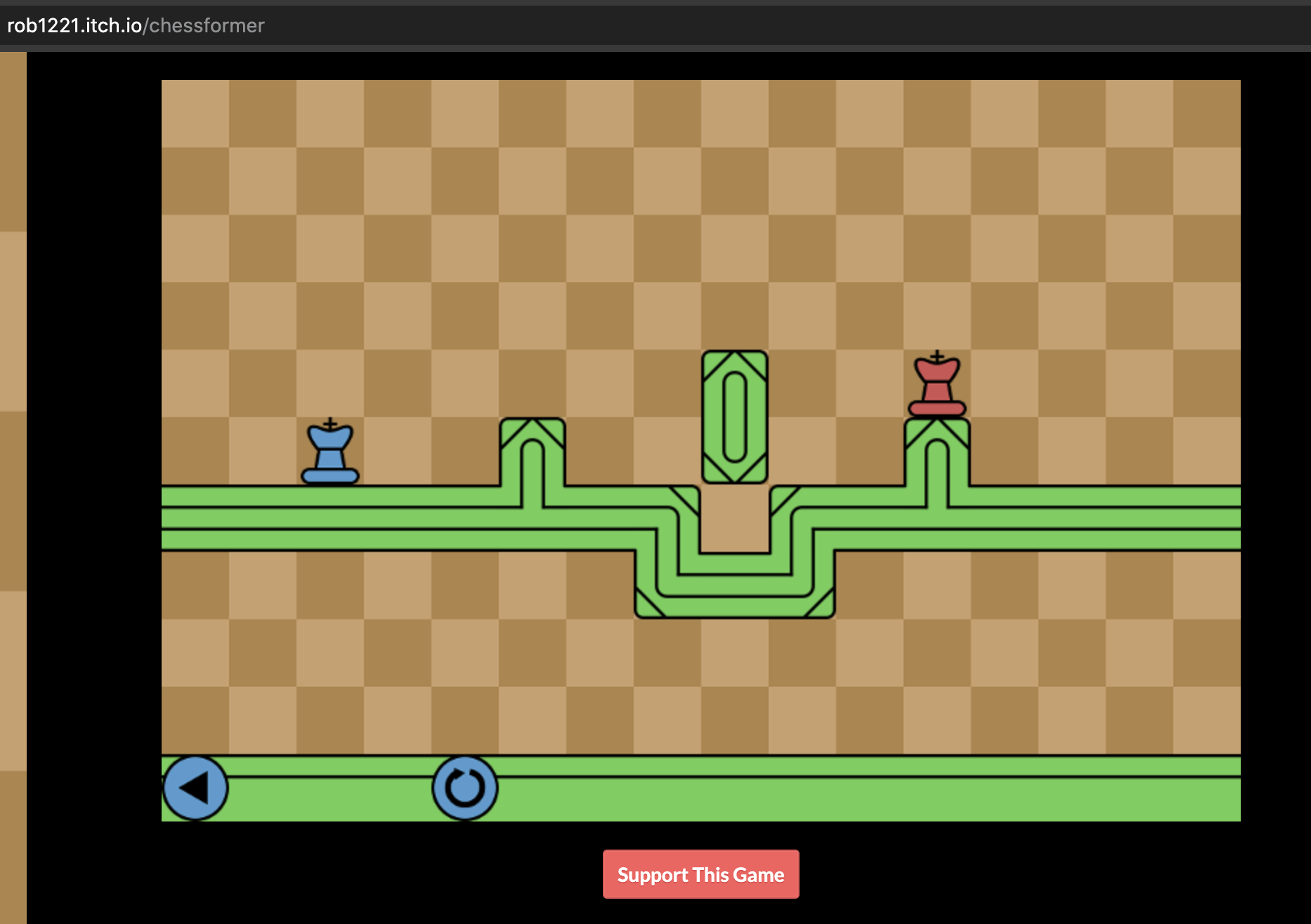 - Chessformer: This is a mobile game you can play on rob1221.itch.io which is a 2D chess game where the pieces fall down after moving to the lowest level. Aim is as always to capture the opposing King (who, to make things easier, never moves)
